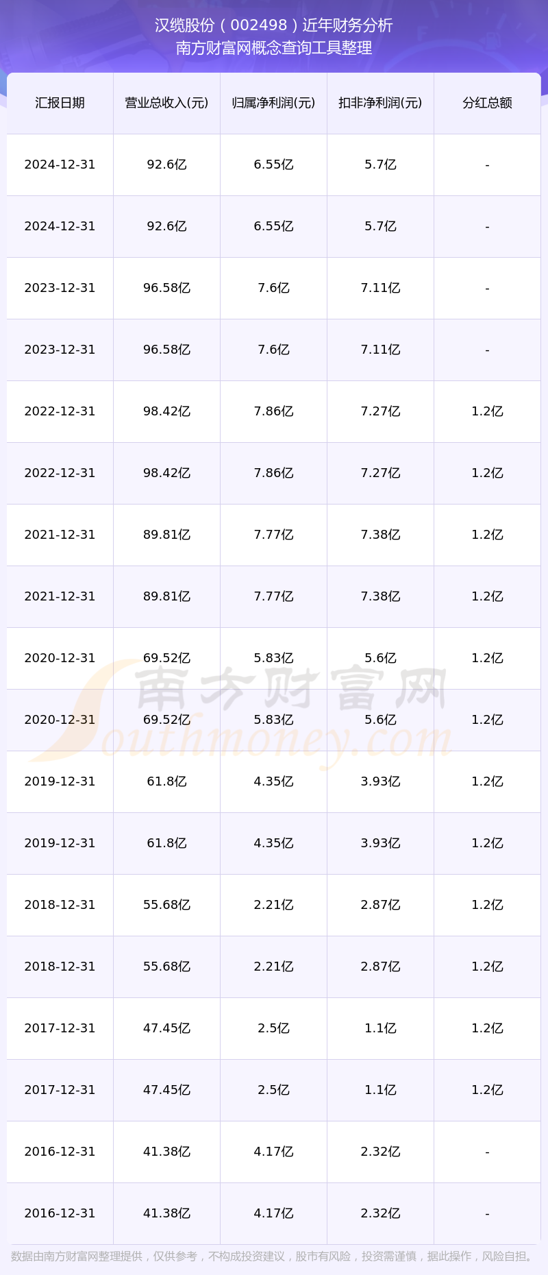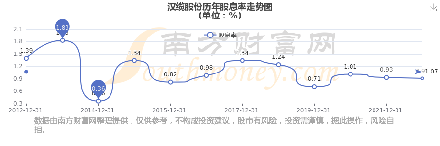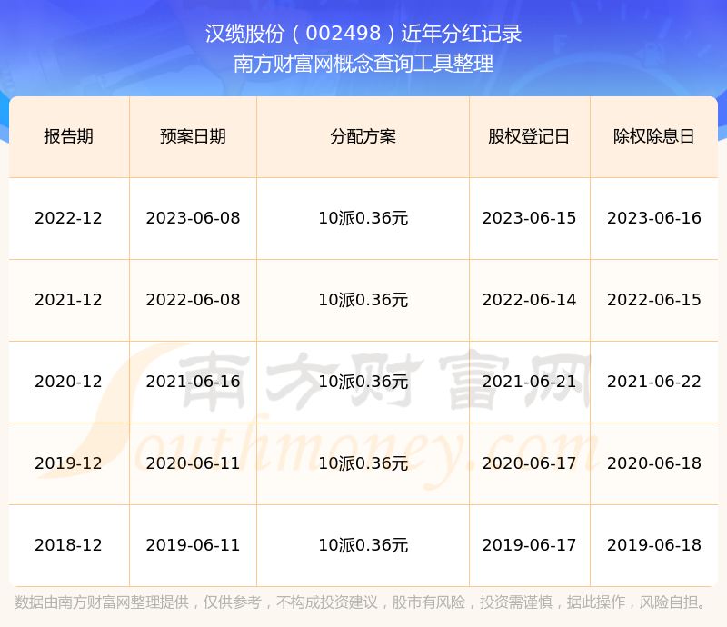 漢纜股份最新一次公布的分紅方案為10派0.36元。本次權益分派股權登記日為2023年6月15日,除權除息日為2023年6月16日,派息日為2023年6月16日。