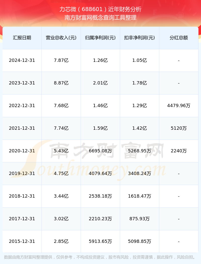 力芯微2024年總營收7.87億,同比增長-11.19%;凈利潤1.26億,同比增長-37.23%;銷售毛利率44.5%。