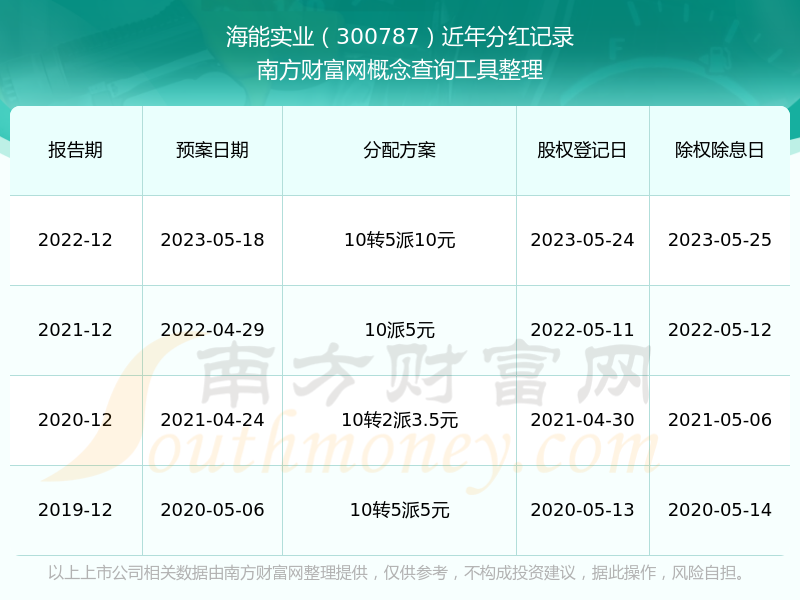 海能實業(yè)最新一次公布的分紅方案為10轉5派10元。本次權益分派股權登記日為2023年5月24日,除權除息日為2023年5月25日,派息日為2023年5月25日。