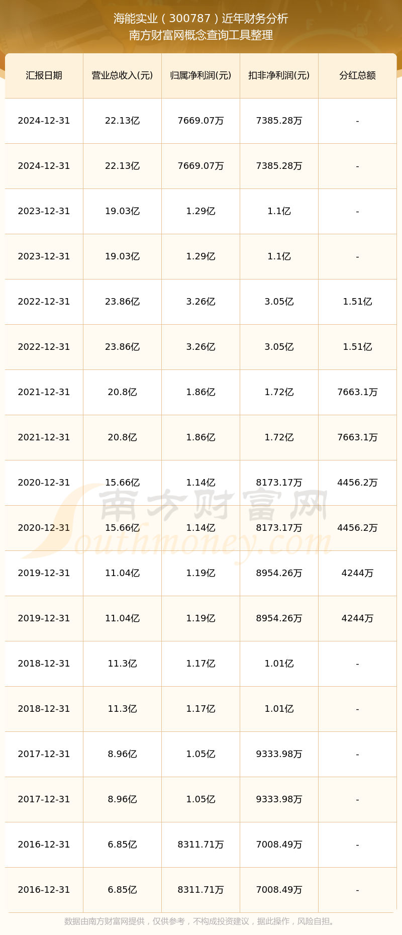近年海能實業(yè)分紅派息情況如下表所示: