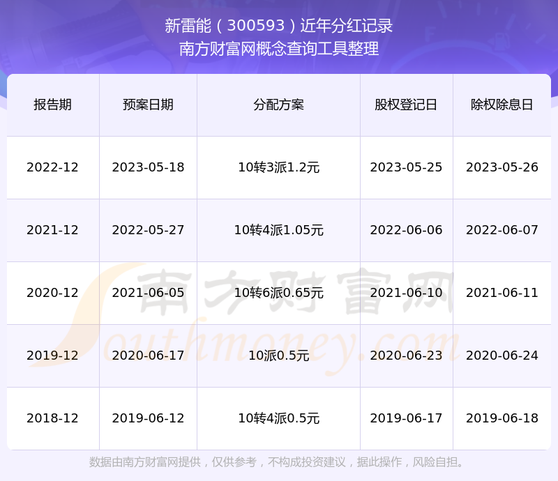 新雷能最新一次公布的分紅方案為10轉(zhuǎn)3派1.2元。本次權(quán)益分派股權(quán)登記日為2023年5月25日,除權(quán)除息日為2023年5月26日,派息日為2023年5月26日。