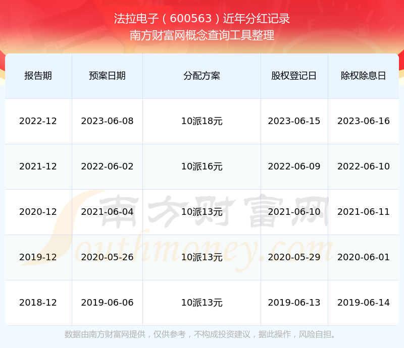 法拉電子最新一次公布的分紅方案為10派18元。本次權(quán)益分派股權(quán)登記日為2023年6月15日,除權(quán)除息日為2023年6月16日,派息日為2023年6月16日。