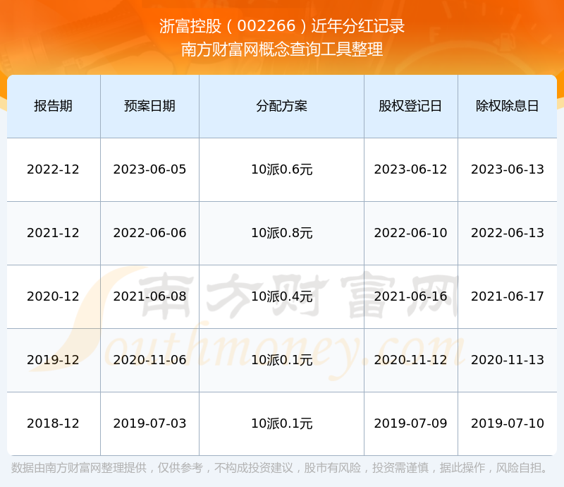 浙富控股最新一次公布的分紅方案為10派0.6元。本次權(quán)益分派股權(quán)登記日為2023年6月12日,除權(quán)除息日為2023年6月13日,派息日為2023年6月13日。