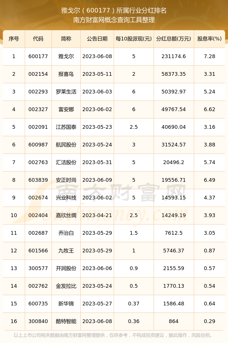 按照南方財富網(wǎng)趨勢選股系統(tǒng)統(tǒng)計,雅戈爾所屬行業(yè)為紡織服裝行業(yè),紡織服裝行業(yè)分紅排名情況如下表: