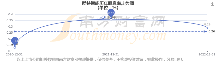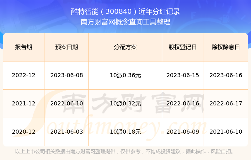 酷特智能最新一次公布的分紅方案為10派0.36元。本次權(quán)益分派股權(quán)登記日為2023年6月15日,除權(quán)除息日為2023年6月16日,派息日為2023年6月16日。