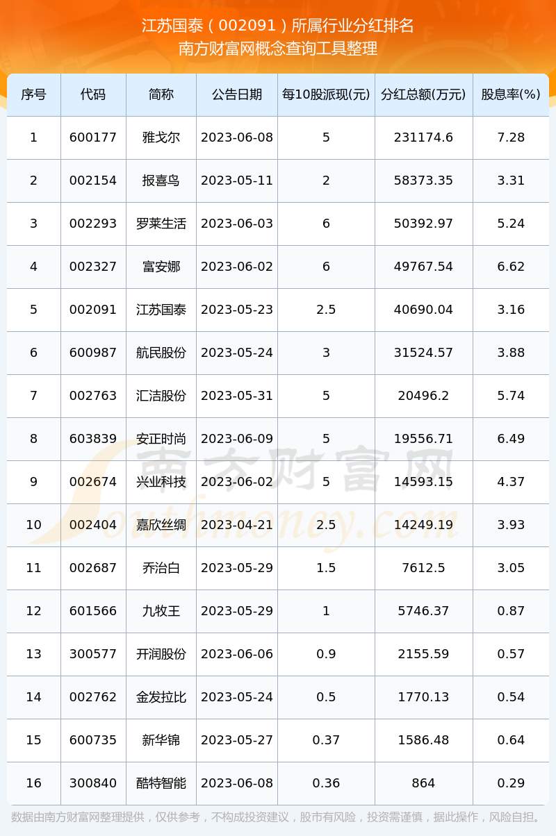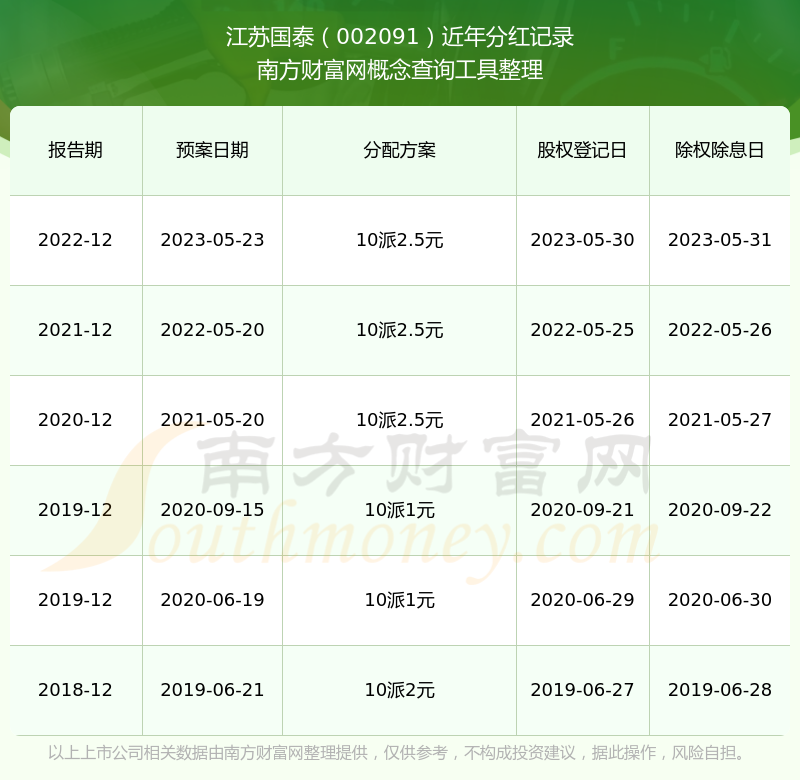 江蘇國泰最新一次公布的分紅方案為10派2.5元。本次權益分派股權登記日為2023年5月30日,除權除息日為2023年5月31日,派息日為2023年5月31日。