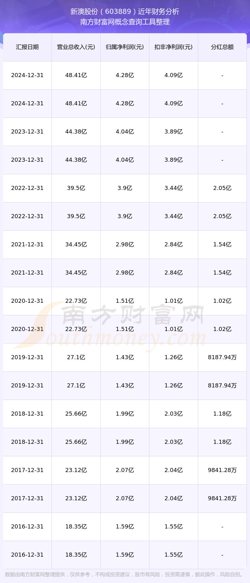 2024年新澳股份總營(yíng)收48.41億,同比增長(zhǎng)9.07%;凈利潤(rùn)4.28億,同比增長(zhǎng)5.96%;銷售毛利率18.98%。