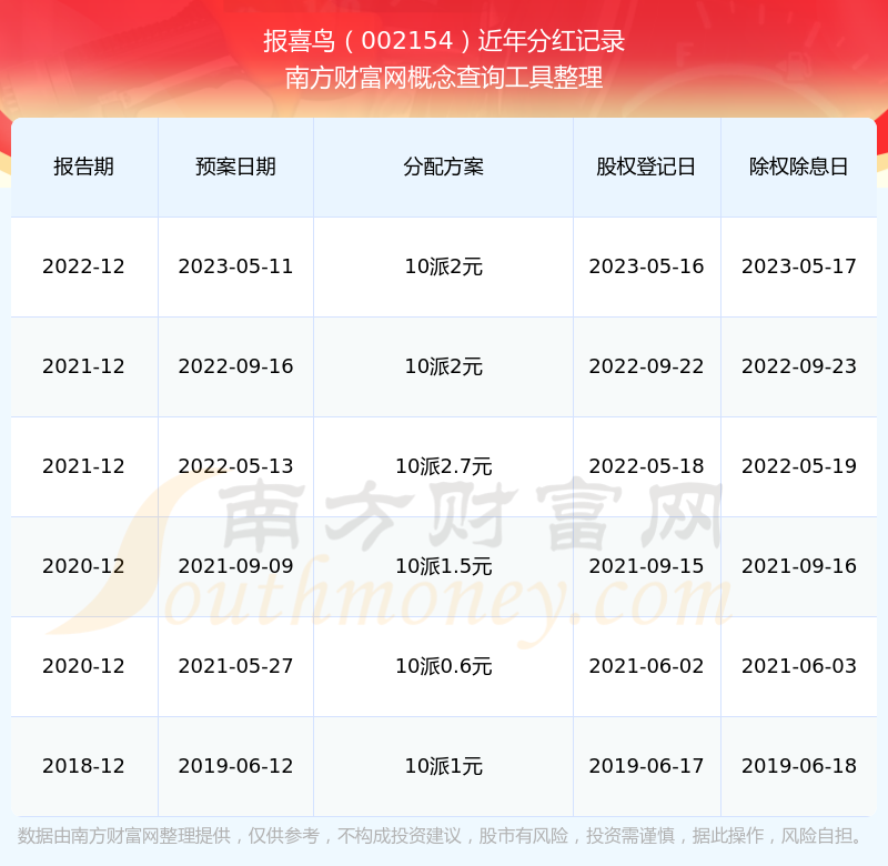 報(bào)喜鳥歷年分紅派息情況如下表所示: