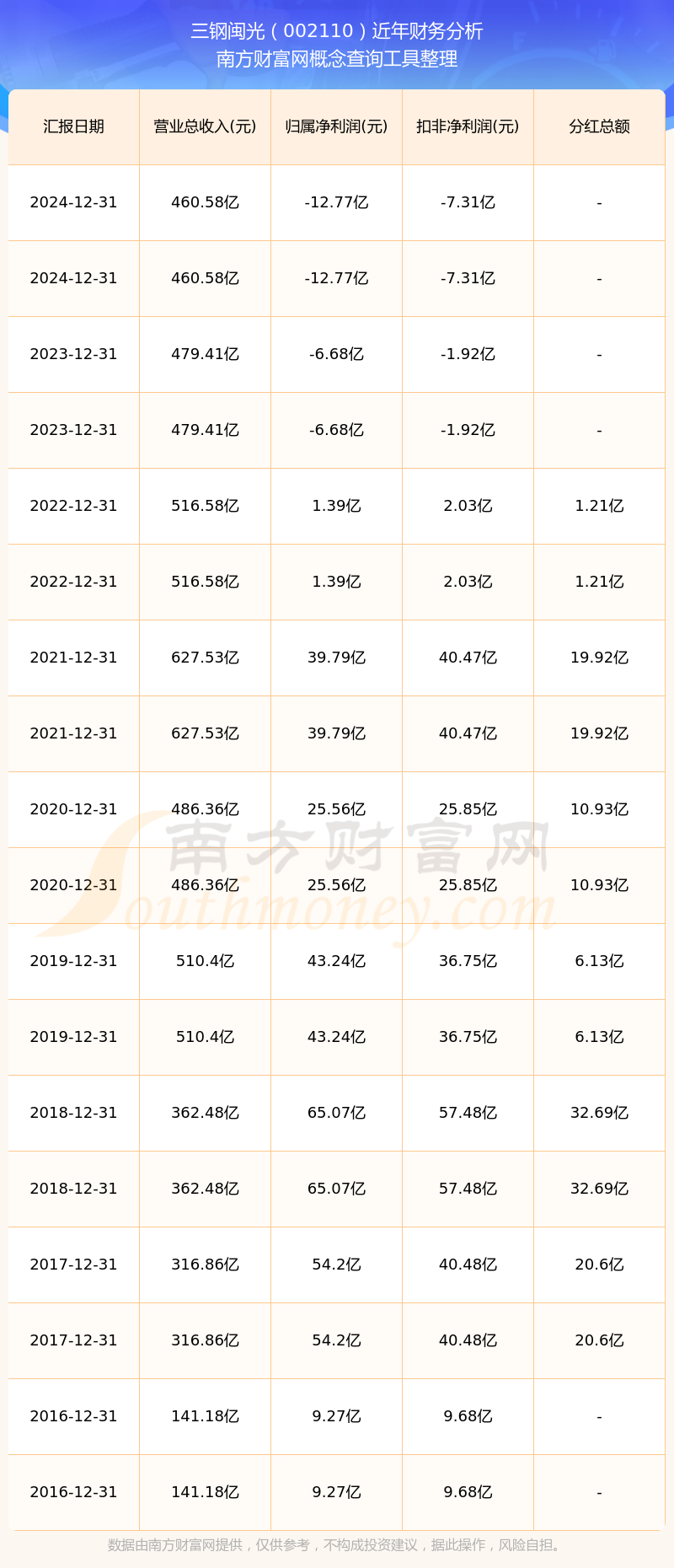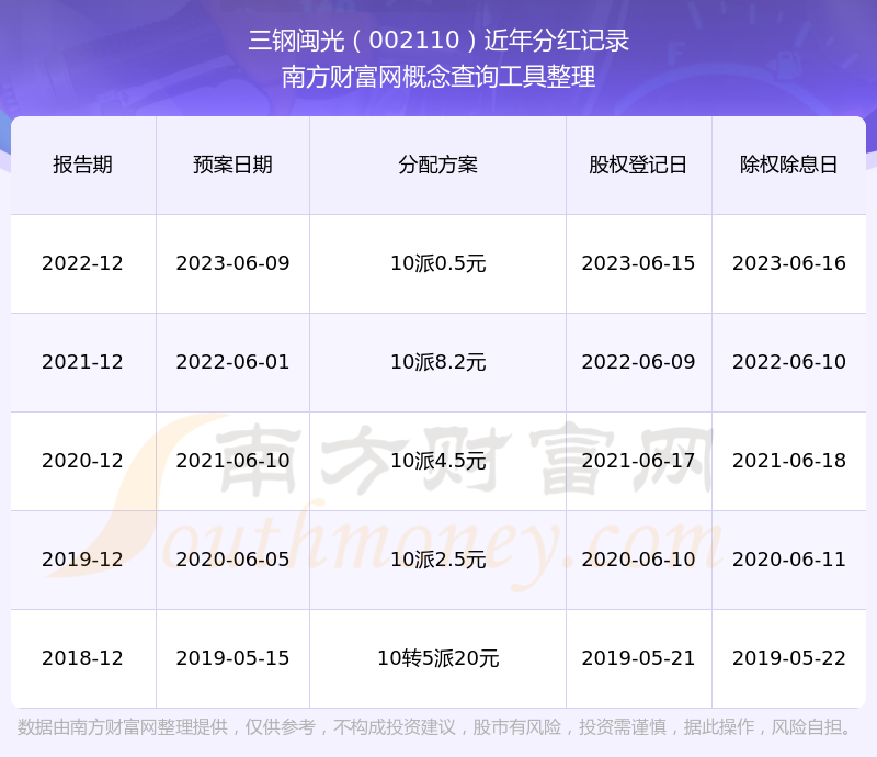 三鋼閩光最新一次公布的分紅方案為10派0.5元。本次權(quán)益分派股權(quán)登記日為2023年6月15日,除權(quán)除息日為2023年6月16日,派息日為2023年6月16日。