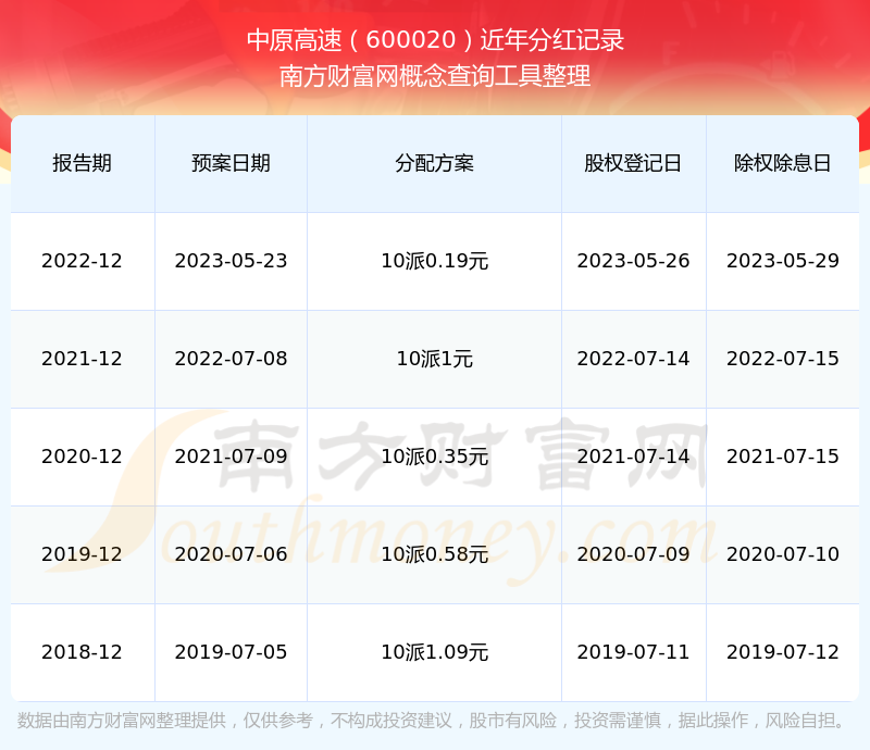 中原高速最新一次公布的分紅方案為10派0.19元。本次權益分派股權登記日為2023年5月26日,除權除息日為2023年5月29日,派息日為2023年5月29日。