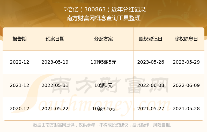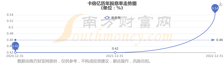 卡倍億最新一次公布的分紅方案為10轉5派5元。本次權益分派股權登記日為2023年5月26日,除權除息日為2023年5月29日,派息日為2023年5月29日。