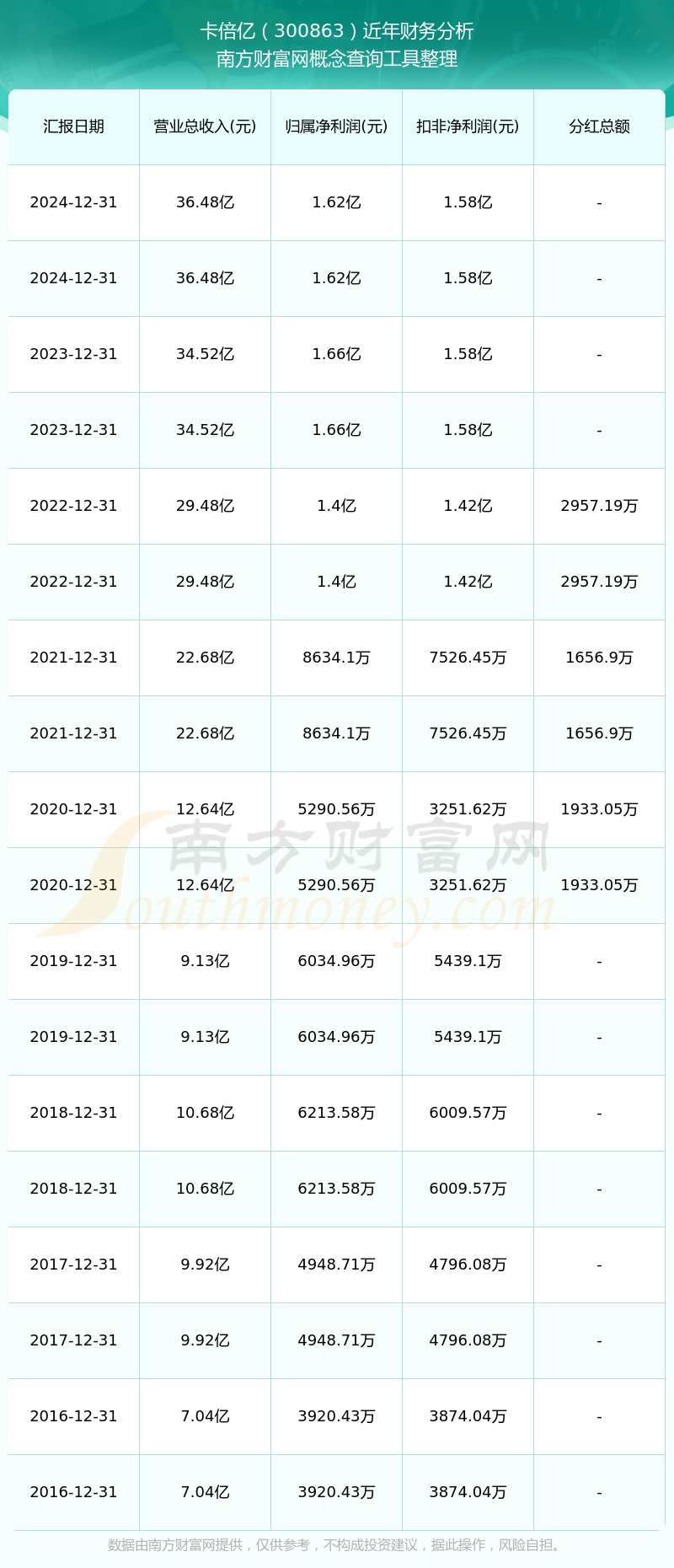 2024年報顯示,卡倍億實現(xiàn)營收36.48億,同比增長5.68%;凈利潤1.62億,同比增長-2.59%;毛利率12.37%。