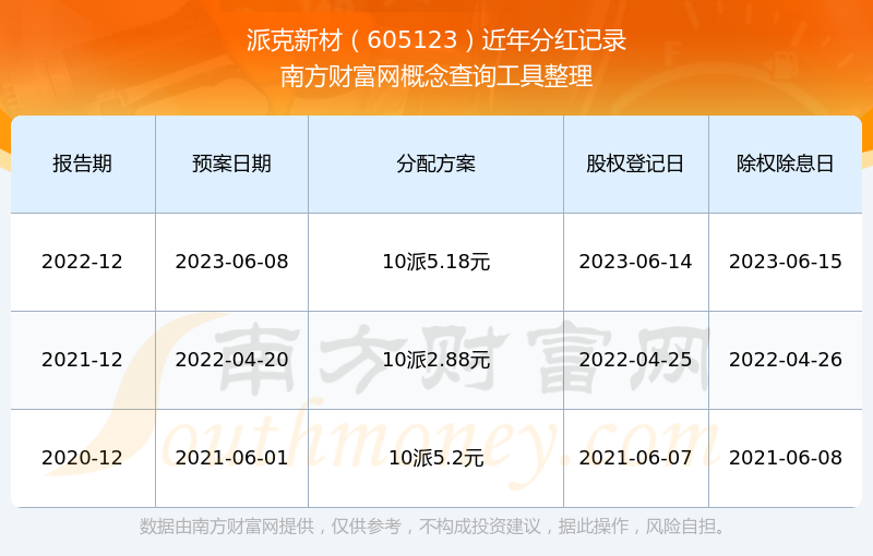 派克新材最新一次公布的分紅方案為10派5.18元。本次權(quán)益分派股權(quán)登記日為2023年6月14日,除權(quán)除息日為2023年6月15日,派息日為2023年6月15日。