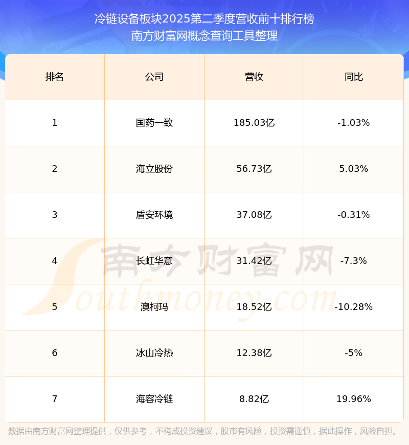 按照南方財(cái)富網(wǎng)概念查詢工具統(tǒng)計(jì),該股所屬板塊為冷鏈設(shè)備板塊,該板塊共有7只股票,海容冷鏈2025第二季度營收在該板塊中排名為第7名,該板塊2025第二季度營收排名前十的股票如下表:
