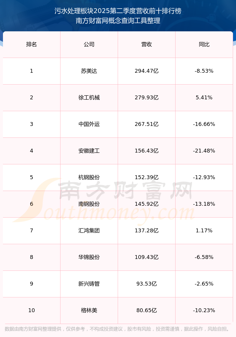 按照南方財富網(wǎng)概念查詢工具統(tǒng)計,該股所屬板塊為污水處理板塊,該板塊共有202只股票,洪城環(huán)境2025第二季度營收在該板塊中排名為第39名,該板塊2025第二季度營收排名前十的股票如下表: