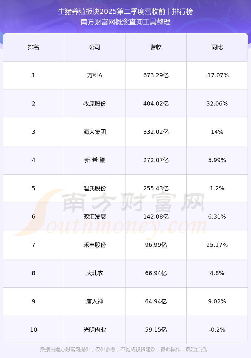 按照南方財(cái)富網(wǎng)概念查詢工具統(tǒng)計(jì),該股所屬板塊為生豬養(yǎng)殖板塊,該板塊共有33只股票,神農(nóng)集團(tuán)2025第二季度營(yíng)收在該板塊中排名為第22名,該板塊2025第二季度營(yíng)收排名前十的股票如下表: