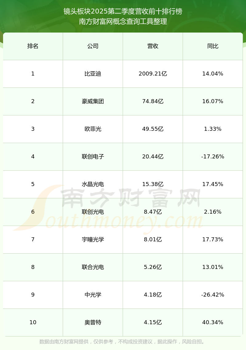 按照南方財(cái)富網(wǎng)概念查詢工具統(tǒng)計(jì),該股所屬板塊為鏡頭板塊,該板塊共有14只股票,力鼎光電2025第二季度營(yíng)收在該板塊中排名為第13名,該板塊2025第二季度營(yíng)收排名前十的股票如下表:
