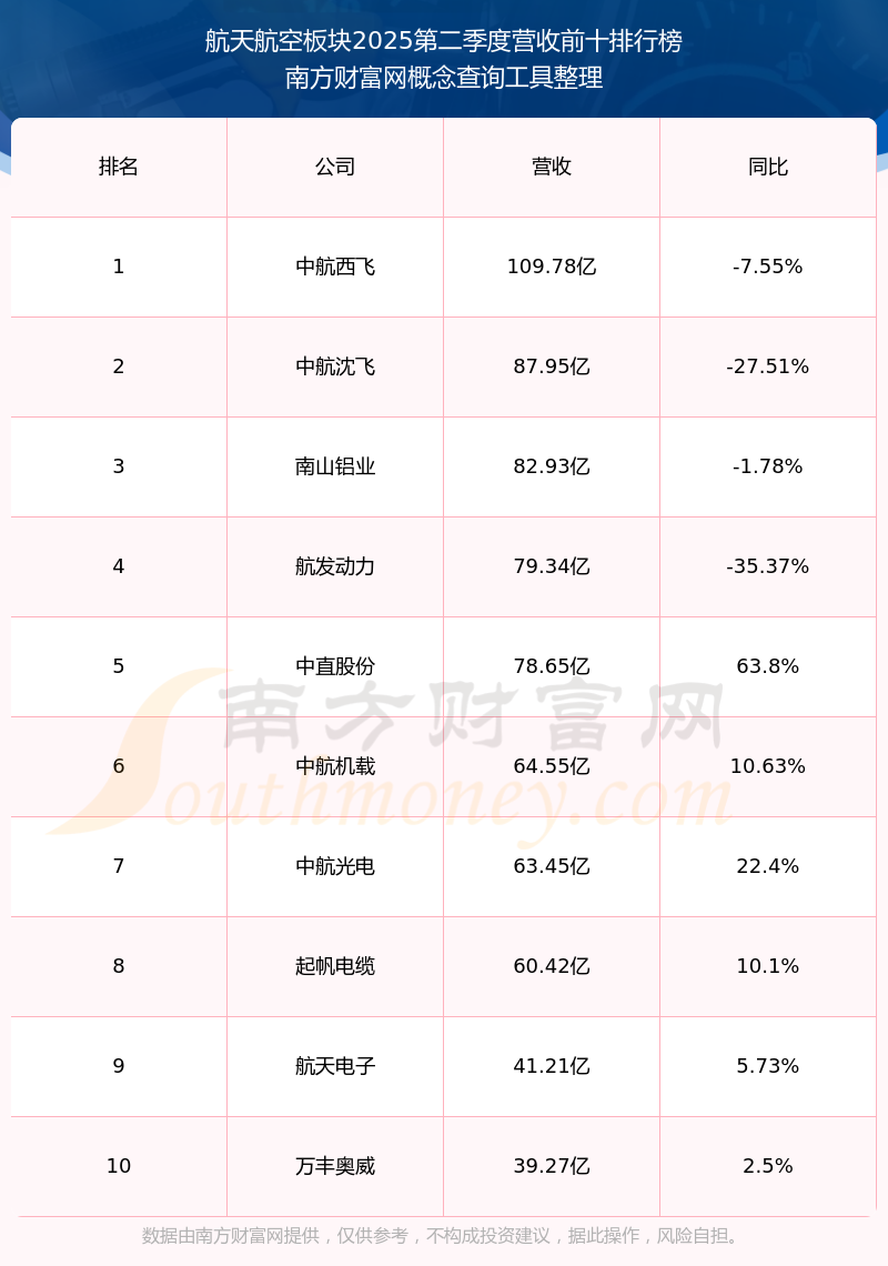 按照南方財富網(wǎng)概念查詢工具統(tǒng)計,該股所屬板塊為航天航空板塊,該板塊共有118只股票,航發(fā)動力2025第二季度營收在該板塊中排名為第4名,該板塊2025第二季度營收排名前十的股票如下表:
