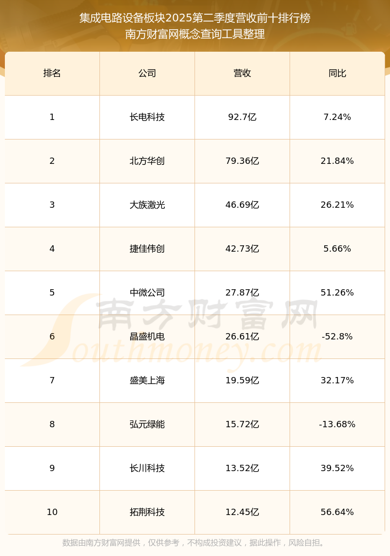 按照南方財富網(wǎng)概念查詢工具統(tǒng)計,該股所屬板塊為集成電路設(shè)備板塊,該板塊共有25只股票,中微公司2025第二季度營收在該板塊中排名為第5名,該板塊2025第二季度營收排名前十的股票如下表: