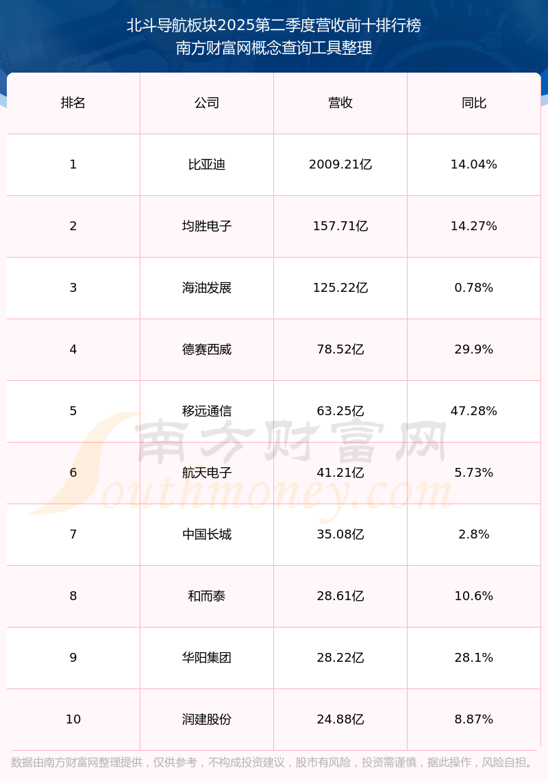 按照南方財富網(wǎng)概念查詢工具統(tǒng)計,該股所屬板塊為北斗導(dǎo)航板塊,該板塊共有117只股票,湘郵科技2025第二季度營收在該板塊中排名為第85名,該板塊2025第二季度營收排名前十的股票如下表: