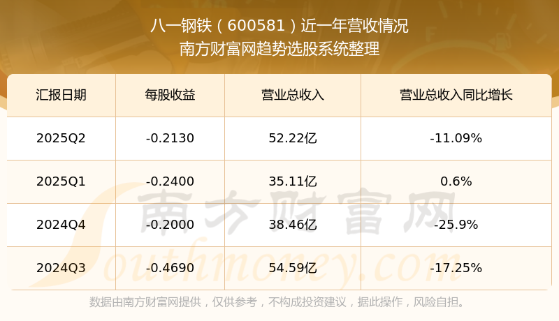 八一鋼鐵2025年第二季度公司實現(xiàn)營業(yè)收入52.22億元,同比-11.09%;歸母凈利潤-3.27億元,同比-5.99%。