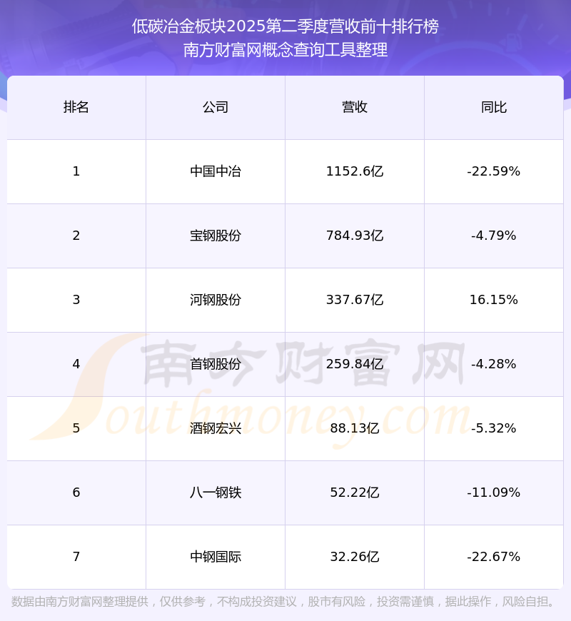 按照南方財富網(wǎng)概念查詢工具統(tǒng)計,該股所屬板塊為低碳冶金板塊,該板塊共有7只股票,八一鋼鐵2025第二季度營收在該板塊中排名為第6名,該板塊2025第二季度營收排名前十的股票如下表: