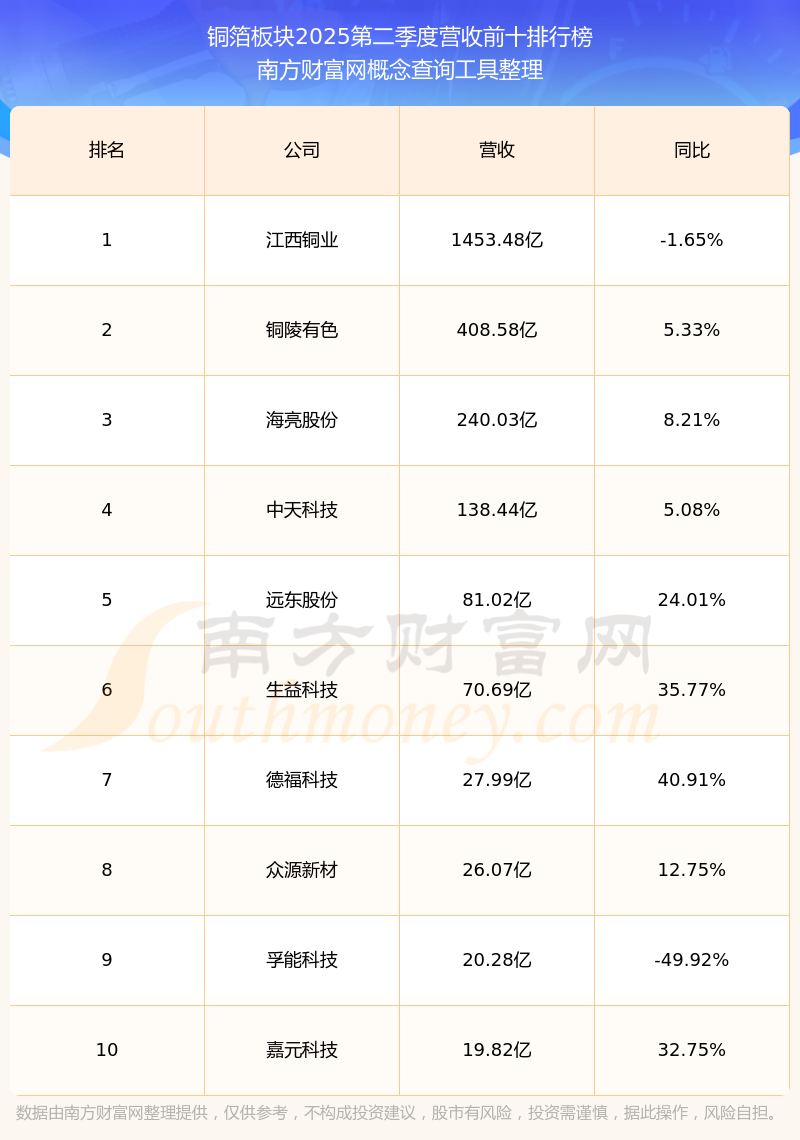 按照南方財(cái)富網(wǎng)概念查詢工具統(tǒng)計(jì),該股所屬板塊為銅箔板塊,該板塊共有23只股票,諾德股份2025第二季度營(yíng)收在該板塊中排名為第11名,該板塊2025第二季度營(yíng)收排名前十的股票如下表: