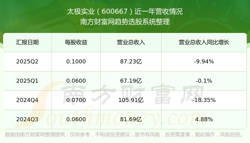 太極實業(yè)(600667)發(fā)布2025年第二季度財報。2025年第二季度太極實業(yè)實現(xiàn)營業(yè)收入87.23億元,同比增加-9.94元%,環(huán)比增加29.82%;凈利潤為2.09億元,同比增長-8.92%,環(huán)比增長77.37%。