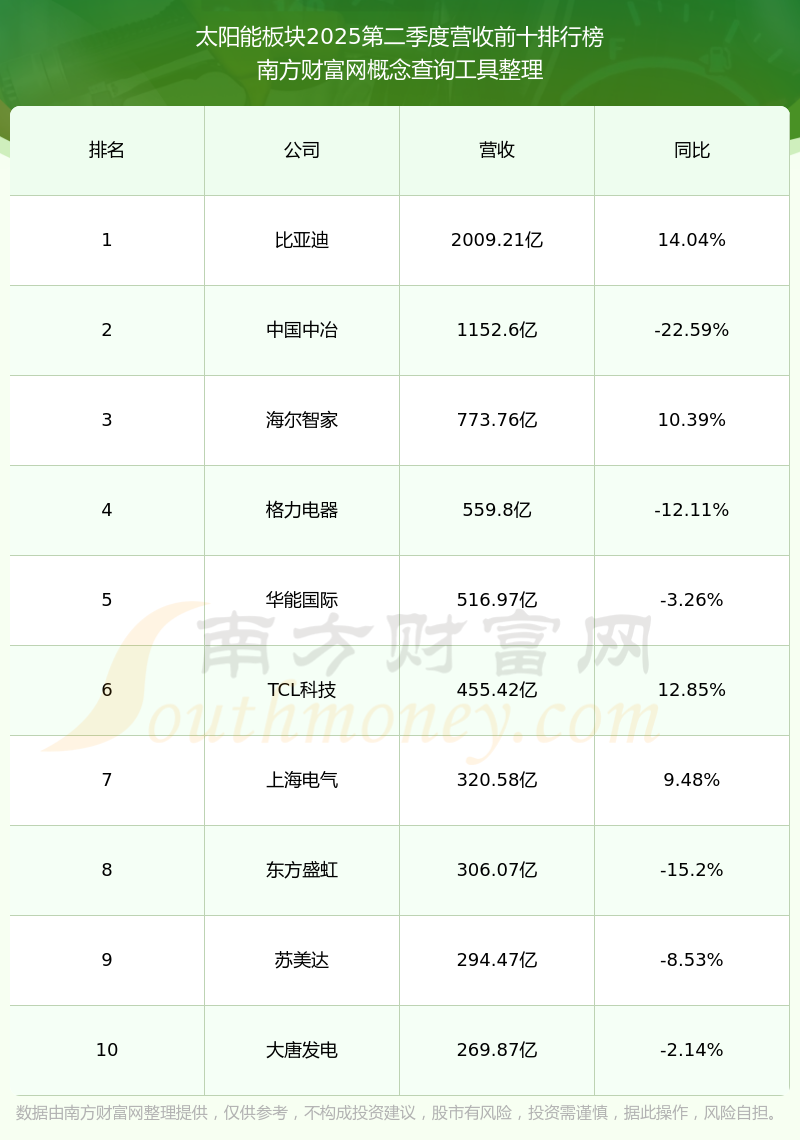 按照南方財富網(wǎng)概念查詢工具統(tǒng)計,該股所屬板塊為太陽能板塊,該板塊共有448只股票,太極實業(yè)2025第二季度營收在該板塊中排名為第42名,該板塊2025第二季度營收排名前十的股票如下表: