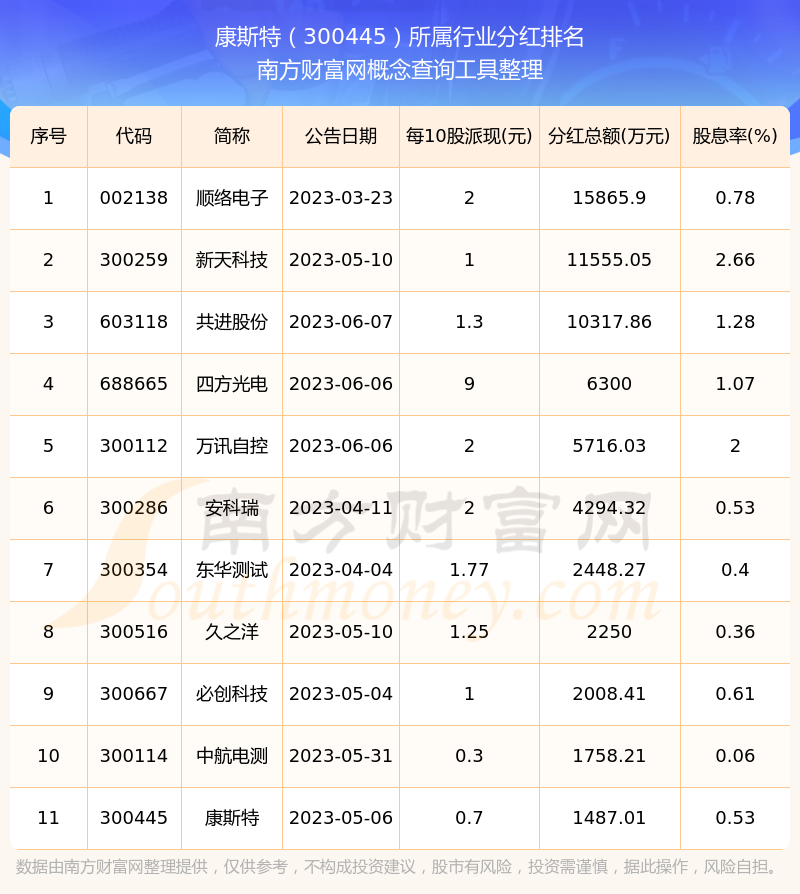 按照南方財(cái)富網(wǎng)趨勢選股系統(tǒng)統(tǒng)計(jì),康斯特所屬行業(yè)為儀器儀表行業(yè),儀器儀表行業(yè)分紅排名情況如下表: