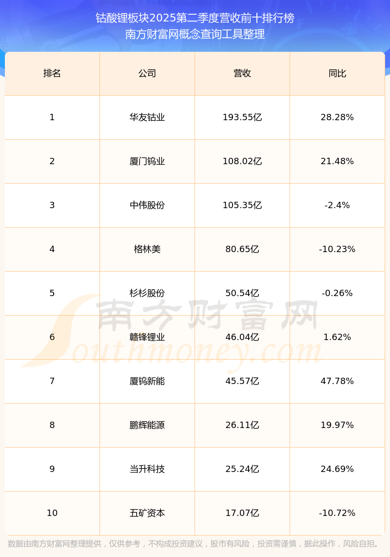 按照南方財富網(wǎng)概念查詢工具統(tǒng)計,該股所屬板塊為鈷酸鋰板塊,該板塊共有21只股票,廈鎢新能2025第二季度營收在該板塊中排名為第7名,該板塊2025第二季度營收排名前十的股票如下表: