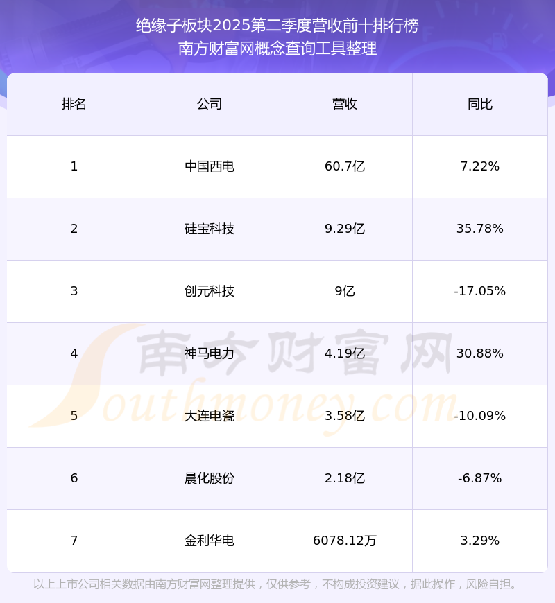 按照南方財(cái)富網(wǎng)概念查詢工具統(tǒng)計(jì),該股所屬板塊為絕緣子板塊,該板塊共有7只股票,神馬電力2025第二季度營收在該板塊中排名為第4名,該板塊2025第二季度營收排名前十的股票如下表:
