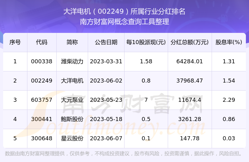 按照南方財富網(wǎng)趨勢選股系統(tǒng)統(tǒng)計,大洋電機所屬行業(yè)為電機行業(yè),電機行業(yè)分紅排名情況如下表: