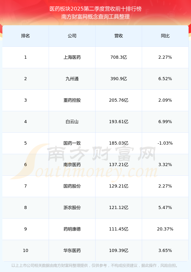 按照南方財富網(wǎng)概念查詢工具統(tǒng)計,該股所屬板塊為醫(yī)藥板塊,該板塊共有498只股票,尖峰集團(tuán)2025第二季度營收在該板塊中排名為第148名,該板塊2025第二季度營收排名前十的股票如下表: