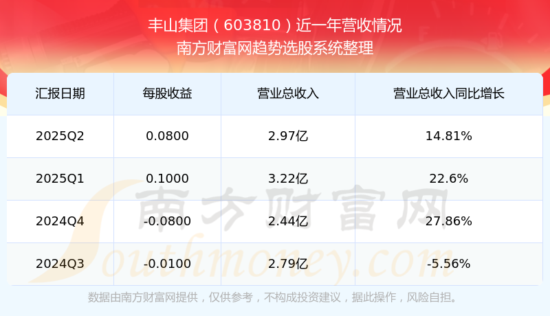 豐山集團(603810)發(fā)布2025年第二季度財報。2025年第二季度豐山集團實現(xiàn)營業(yè)收入2.97億元,同比增加14.81元%,環(huán)比增加-7.96%;凈利潤為1393.8萬元,同比增長221.43%,環(huán)比增長-14.89%。