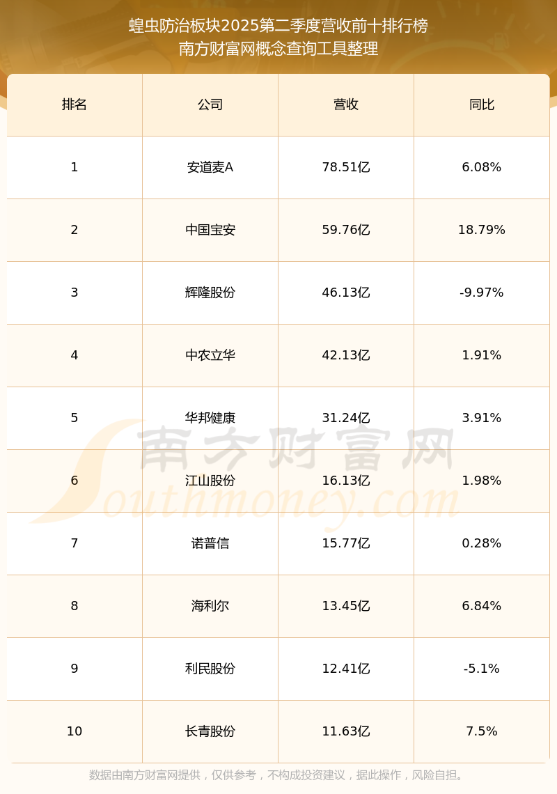 按照南方財富網(wǎng)概念查詢工具統(tǒng)計,該股所屬板塊為蝗蟲防治板塊,該板塊共有16只股票,豐山集團2025第二季度營收在該板塊中排名為第15名,該板塊2025第二季度營收排名前十的股票如下表: