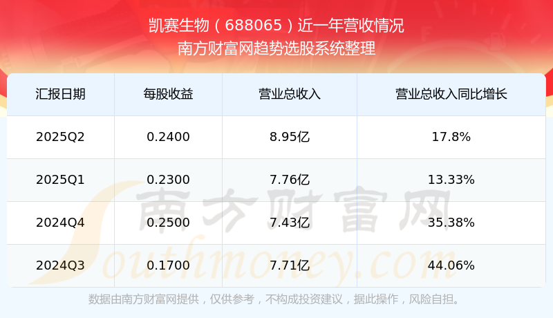 于2025年第二季度,凱賽生物披露了其業(yè)績表現(xiàn),其中主營業(yè)務(wù)收入8.95億元,相較于去年同期17.8%。此外,公司歸屬于母公司的凈利潤為1.72億元,同比增長了20.77%。在扣除所有非經(jīng)常性損益后,凈利潤1.61億元,同比增長17.83%。