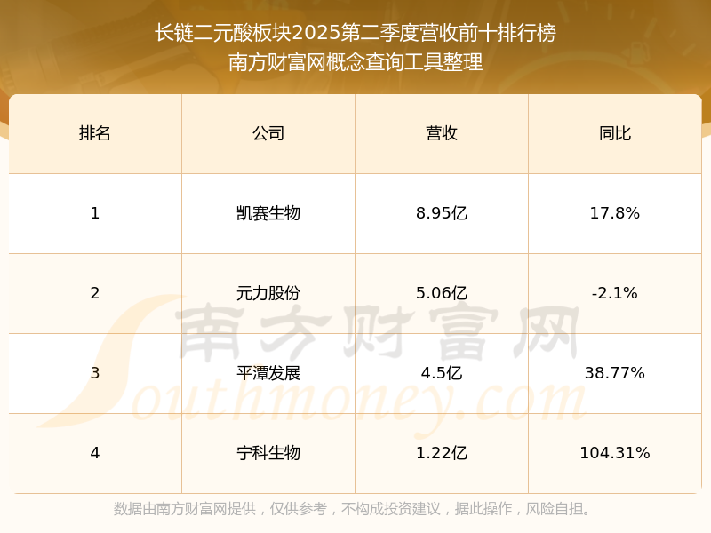 按照南方財富網(wǎng)概念查詢工具統(tǒng)計,該股所屬板塊為長鏈二元酸板塊,該板塊共有4只股票,凱賽生物2025第二季度營收在該板塊中排名為第1名,該板塊2025第二季度營收排名前十的股票如下表: