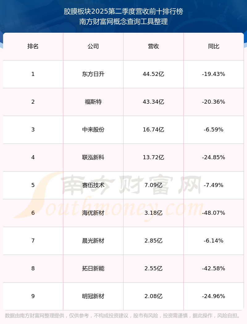 按照南方財(cái)富網(wǎng)概念查詢工具統(tǒng)計(jì),該股所屬板塊為膠膜板塊,該板塊共有9只股票,萊爾科技2025第二季度營收在該板塊中排名為第9名,該板塊2025第二季度營收排名前十的股票如下表: