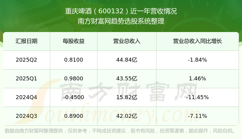 重慶啤酒(600132)披露2025年第二季度報(bào)告,報(bào)告期實(shí)現(xiàn)營(yíng)收44.84億元,同比-1.84%;歸母凈利潤(rùn)3.92億元,同比-12.7%;扣非凈利潤(rùn)3.88億元,同比-12.26%。