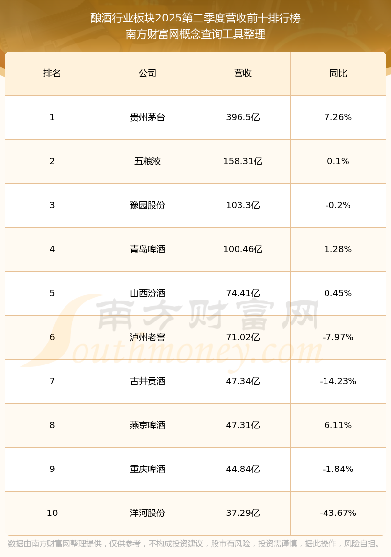 按照南方財(cái)富網(wǎng)概念查詢工具統(tǒng)計(jì),該股所屬板塊為釀酒行業(yè)板塊,該板塊共有42只股票,重慶啤酒2025第二季度營(yíng)收在該板塊中排名為第9名,該板塊2025第二季度營(yíng)收排名前十的股票如下表: