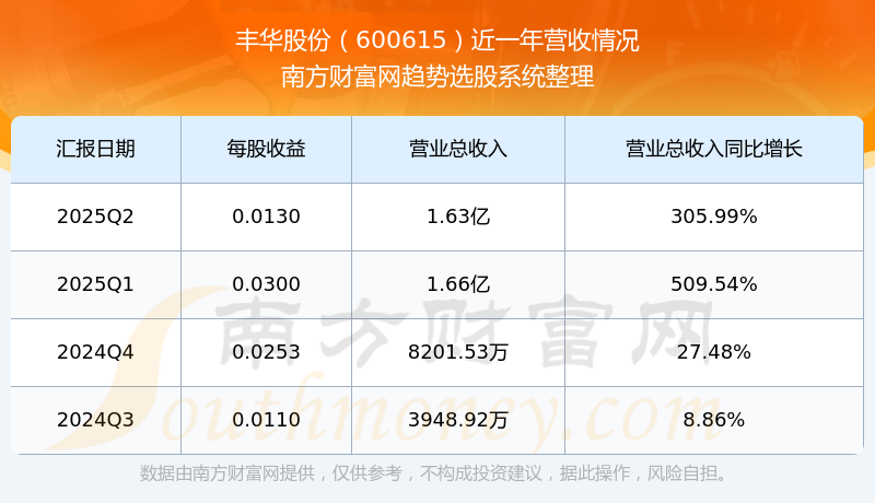 豐華股份2025年第二季度公司實(shí)現(xiàn)營業(yè)收入1.63億元,同比305.99%;歸母凈利潤454.74萬元,同比146.8%。