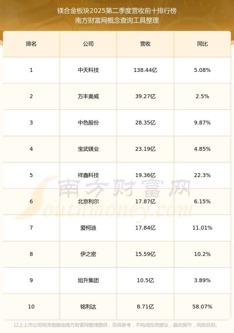 按照南方財富網(wǎng)概念查詢工具統(tǒng)計,該股所屬板塊為鎂合金板塊,該板塊共有17只股票,豐華股份2025第二季度營收在該板塊中排名為第16名,該板塊2025第二季度營收排名前十的股票如下表: