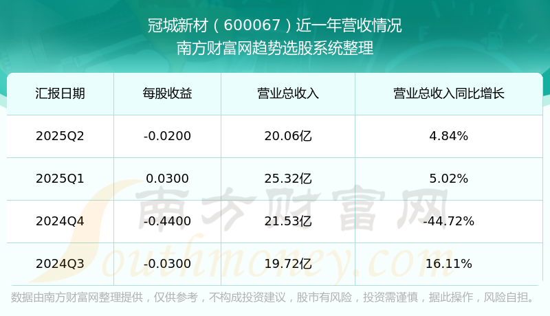 在2025年第二季度,冠城新材的業(yè)績表現(xiàn),主營業(yè)務(wù)收入達到20.06億元,實現(xiàn)了4.84%的同比增長率。同時,公司歸母凈利潤錄得-1523.68萬元,同比增長66.62%。