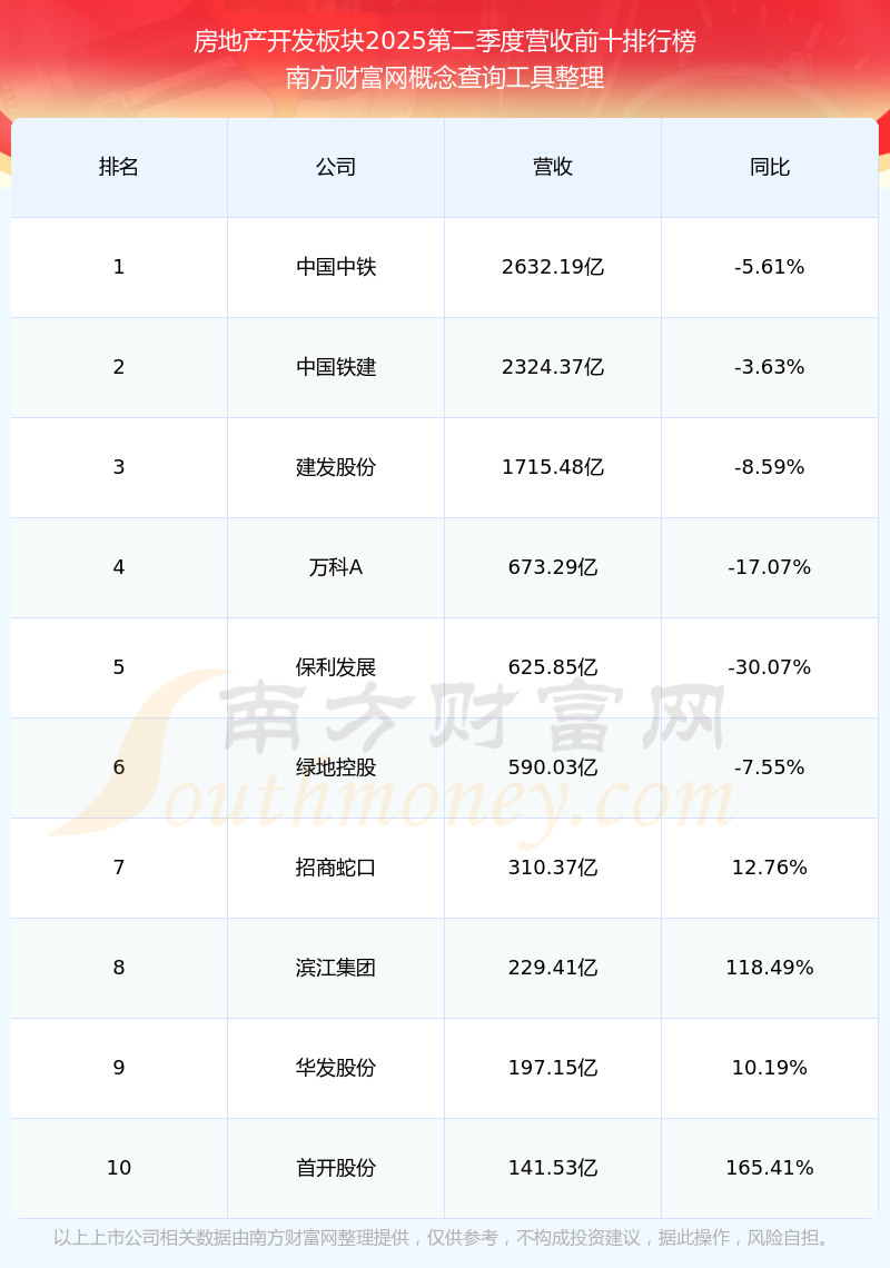 按照南方財富網(wǎng)概念查詢工具統(tǒng)計,該股所屬板塊為房地產(chǎn)開發(fā)板塊,該板塊共有143只股票,冠城新材2025第二季度營收在該板塊中排名為第29名,該板塊2025第二季度營收排名前十的股票如下表: