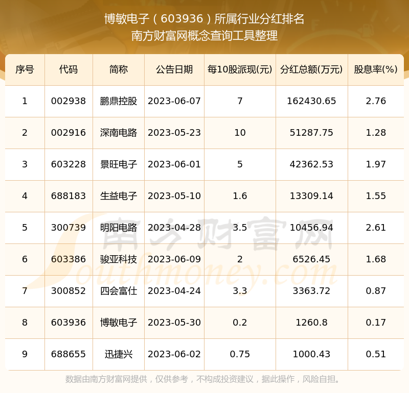 按照南方財(cái)富網(wǎng)趨勢(shì)選股系統(tǒng)統(tǒng)計(jì),博敏電子所屬行業(yè)為印制電路板行業(yè),印制電路板行業(yè)分紅排名情況如下表: