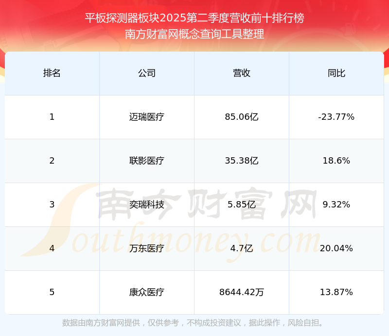按照南方財(cái)富網(wǎng)概念查詢工具統(tǒng)計(jì),該股所屬板塊為平板探測器板塊,該板塊共有5只股票,康眾醫(yī)療2025第二季度營收在該板塊中排名為第5名,該板塊2025第二季度營收排名前十的股票如下表: