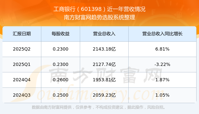 財(cái)報(bào)顯示,2025年第二季度工商銀行營(yíng)收2143.18億元,同比增長(zhǎng)6.81%,凈利潤(rùn)839.47億元,同比增長(zhǎng)1.37%。