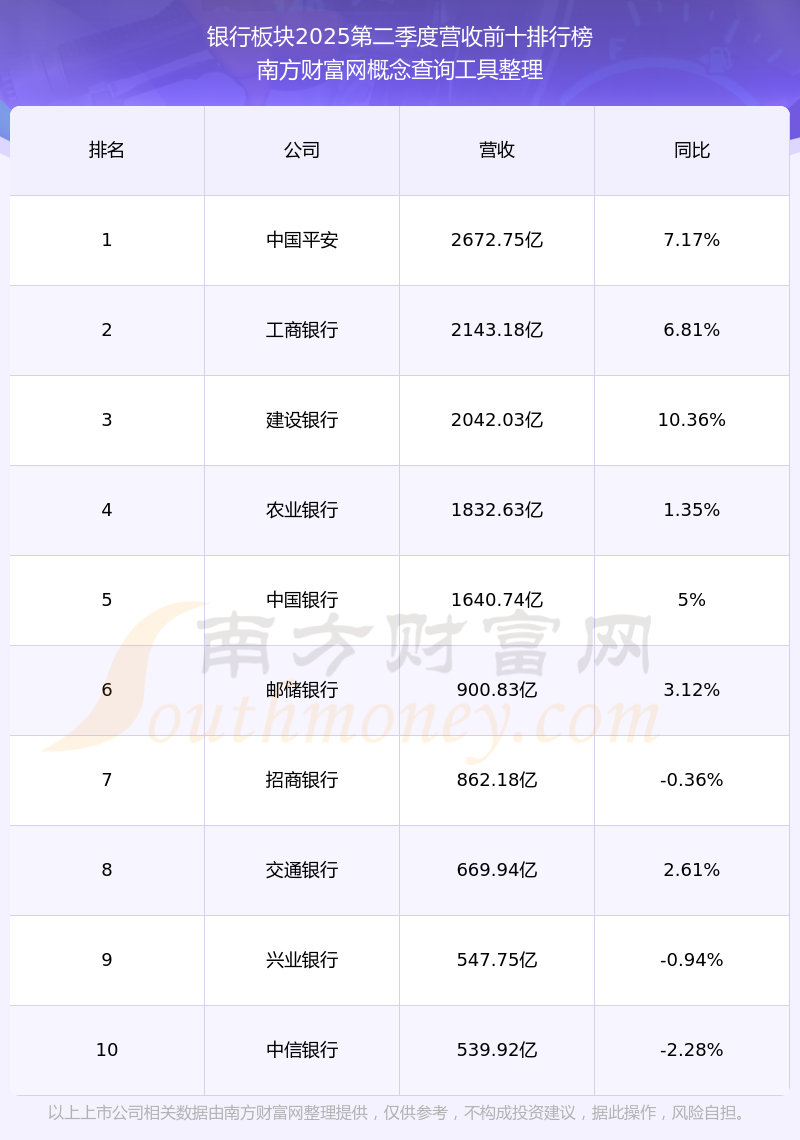 按照南方財(cái)富網(wǎng)概念查詢工具統(tǒng)計(jì),該股所屬板塊為銀行板塊,該板塊共有44只股票,工商銀行2025第二季度營(yíng)收在該板塊中排名為第2名,該板塊2025第二季度營(yíng)收排名前十的股票如下表: