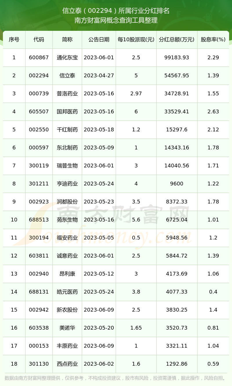 按照南方財富網(wǎng)趨勢選股系統(tǒng)統(tǒng)計,信立泰所屬行業(yè)為制劑行業(yè),制劑行業(yè)分紅排名情況如下表: